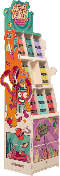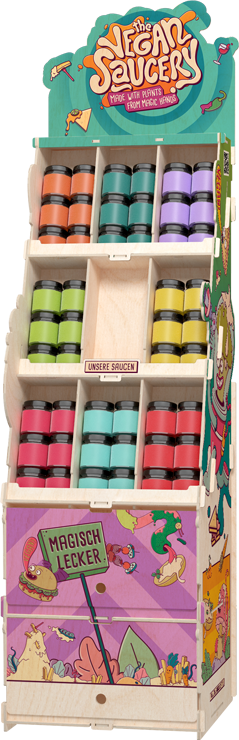 Der präsentierte Holzständer wurde für die Firma Vegan Saucery hergestellt, die vegane Saucen herstellt. Sie führen Ihr Unternehmen mit dem Ziel, Ihren Kunden gesunde, natürliche Lebensmittel mit Respekt vor der Natur anzubieten. Wie Sie sehen, stellt die von uns vorgeschlagene ökologische Werbung in Form eines Displays die perfekte Ergänzung zu bewusstem Wirtschaften dar. Der Ständer besteht aus zertifiziertem Sperrholz (FSC) in einer Farbpalette, die dem Image von Vegan Saucery entspricht. Das Regal ist wie ein Ladenregal geformt und bietet Platz für eine Vielzahl von Produkten des Herstellers.Details Das Regal hat 4 Böden, die jeweils ca. 40 kg tragen können. Der Druck wurde in UV-Technologie hergestellt. Wichtig ist, dass der Ständer extrem einfach zu montieren ist und kein Werkzeug benötigt. Wir versenden zerlegt und flach verpackt.