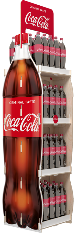 Wir haben dieses Display für einen Getränkehersteller gemacht - Coca-Cola. Wie Siesehen können, ist der Stand äußerst farbenfroh. Bei der Erstellung dieses Projekts mussten wir berücksichtigen, dass der Stand eine erhebliche Ladungtragen muss - Säfte haben normalerweise ein Fassungsvermögen von 1,5 Liter. Zusätzlich forderteder Kunde 4 Regale. Einzelheiten Der Coca Cola-Stand wurde sehr attraktiv gebrandmarkt (die Farbpalette, der Topper, der den Stand krönt, wurde mit dem Logo des Kunden und den Grafiken verziert), um die Aufmerksamkeitdes Empfängers auf sich zu ziehen und von ihm in Erinnerung zu bleiben. Es enthält 3 Regale, von denen jedes ein Gewicht von ca. 40 kg tragen kann. Das Display ist sehr einfach zusammenzusetzen und Sie dazu kein Werkzeug benötigen. Wir versenden eszerlegt und flach verpackt.