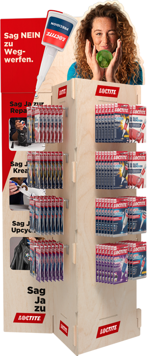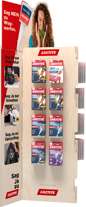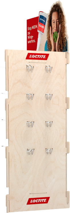 Ständer aus Sperrholz für das Unternehmen Loctite, bekannt für die Herstellung von Klebstoffen und anderen Befestigungslösungen, ist darauf ausgelegt, die Produkte der Marke bequem und effizient zu präsentieren. Der Ständer besteht aus hochwertigem, langlebigem Sperrholz, das Stabilität und ein ästhetisches Erscheinungsbild gewährleistet. Das moderne und professionelle Design des Ständers entspricht der visuellen Identität von Loctite. Das stilvolle Finish und die Farbgestaltung spiegeln die Robustheit und Innovationskraft der Marke wider.