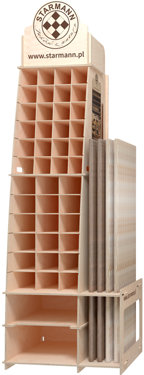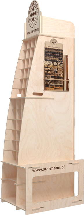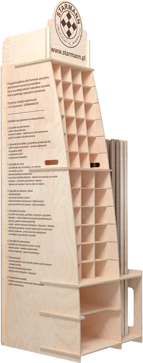 The wooden stand presented was prepared for the firm Starmann, which dealswith the cleaning brushes. As you can see, the ecological advertising proposed by our company in the form of a display isthe perfect complement for a consciously conducted business.The stand was made with certified plywood (FSC) in a colour range that matches the image of Starmann. The stand has the form of a shop shelf and is capable of holding a wide range of products from the producer.